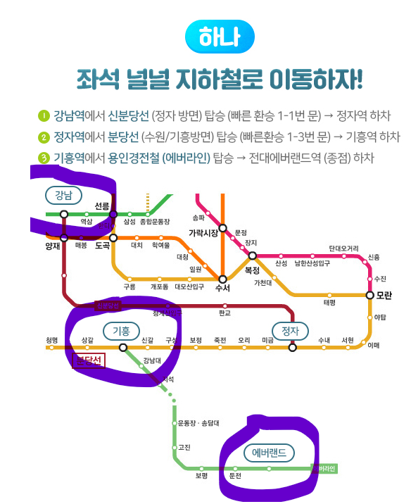 강남역 10번출구 바로 앞에 5001번, 5003번을 타고 기흥역에서 하차한다! 기흥역까지 두번이나 환승해야하므로 우선 버스를 타고, 이후 다시 경전철을 타고 에버랜드 역에 내려서 셔틀버스를 탄다!