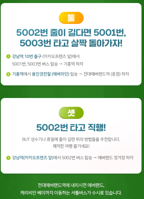 강남역(카카오프렌즈 앞)에서 5002번 버스를 탑승한다! 에버랜드 정거장에 하차한다. 에버랜드 정거장에 하차하면 이후 에버랜드로 직접 이동하는 셔틀버스를 타고 이동한다!
