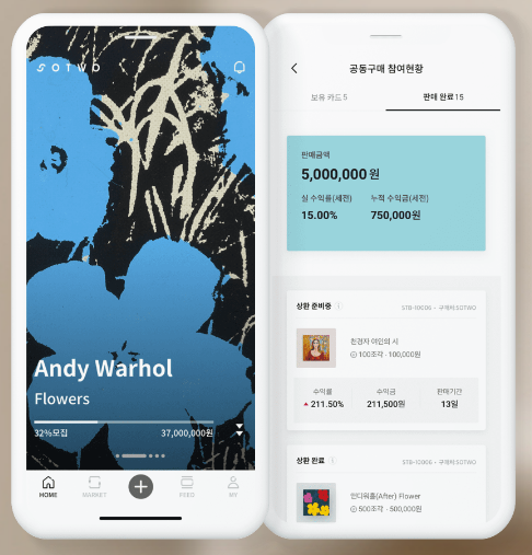 모집 완료 후 판매되는 시점의 시세에 따라 수익금이 변동될 수 있고 판매 금액에서 판매 시 발생하는 제반비용을 제외한 금액이 소유권에 비례해 분배되는 구조다. 매각에 대한 판매 동의 투표를 진행할 수 있고 투표 결과 51% 이상 판매에 동의하면 해당 가격으로 판매가 진행되며 미만일 경우 다음 매입 제안 시까지 판매가 지속되는 구조다. 소투에 따르면 조각투자로 판매된 미술품은 평균 16.9%의 수익률을 냈다. 가입자 95% 이상이 미술품 투자에 관심이 많은 젊은 세대였다. 소투의 경우에는 일찌감치 신한은행 앱을 통해 미술품 조각투자를 지원하는 시도도 했었으며 본 회사가 서울옥션이라는 거대한 미술옥션 회사인지라 앞으로도 다양하고 더 새로운 방식의 미술품 공동구매를 지원할 것으로 전망된다. 서울옥션 역시 투자계약증권으로 현재 금감원에 투자계약증권 신고서 제출을 준비 중에 있다.