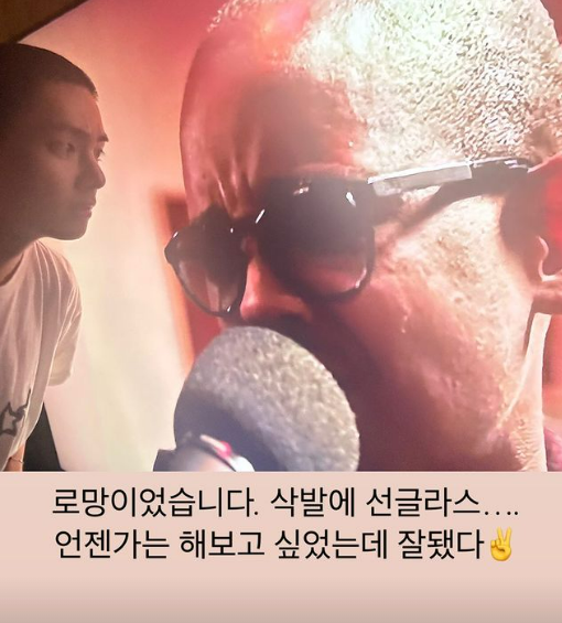 두번째 사진 속에선 반팔 티셔츠를 착용하고 흑인 삭발 가수의 공연을 바라보고 있는 모습으로