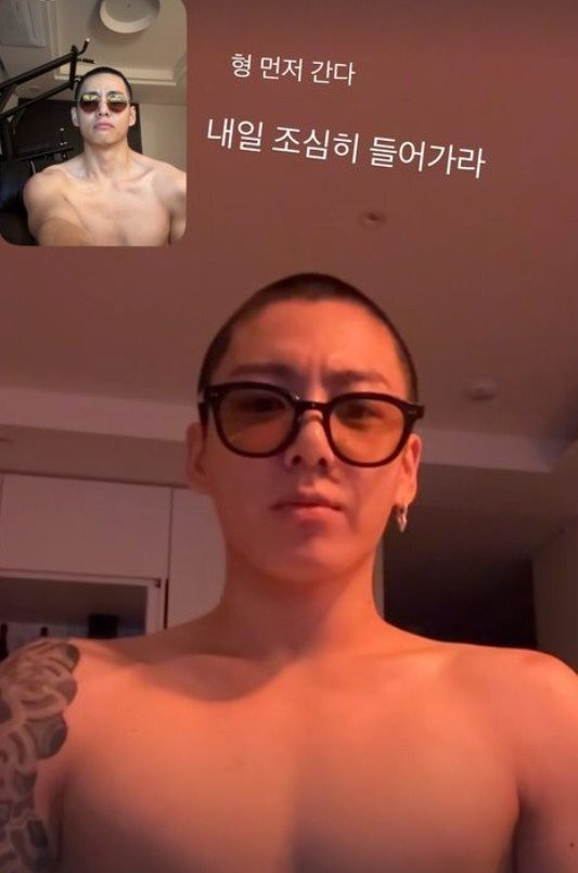 첫번째 사진 속에선 오렌지색 점퍼에 어두운색 스카프를 메고 선글라스를 낀 반 삭발의모습,