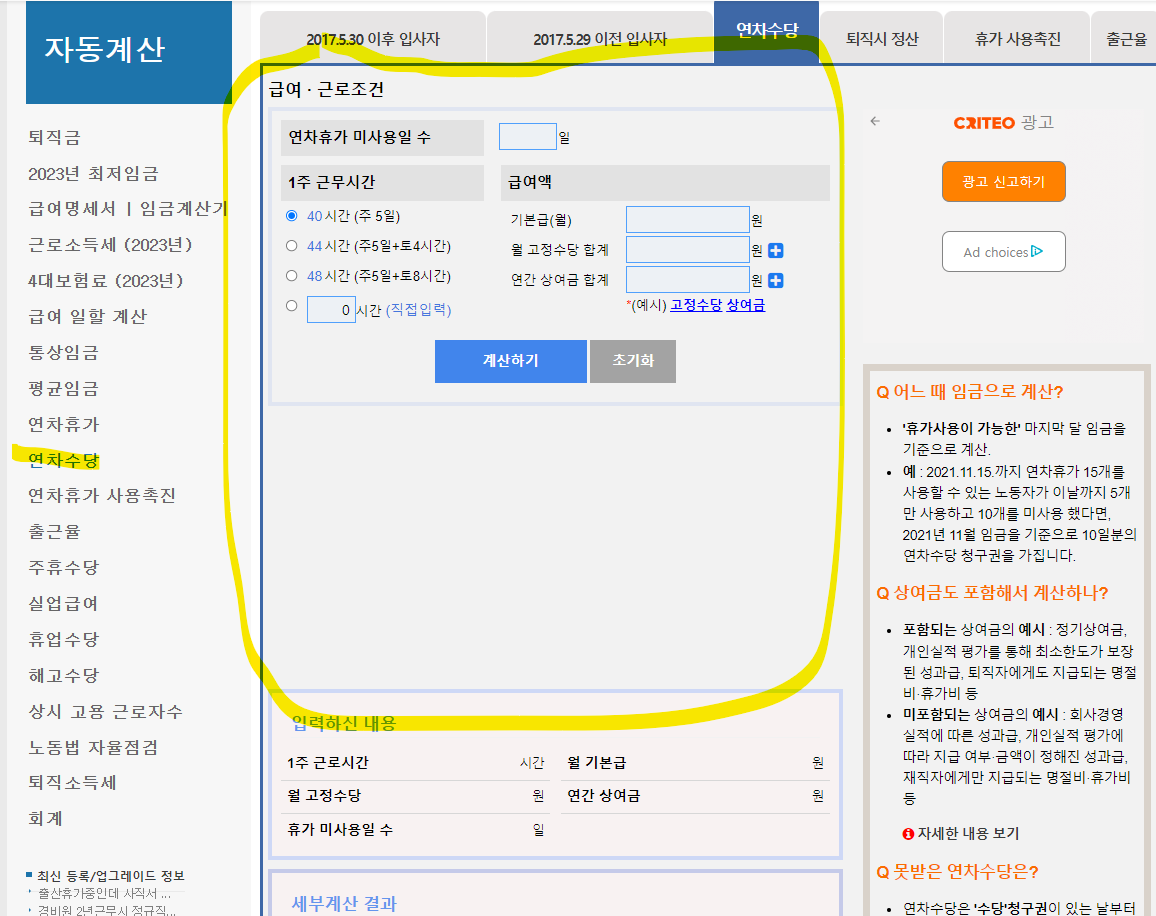 회원가입하여 많이 찾는 메뉴를 통해 연차휴가 및 연차수당 자동계산 기능을 이용해보세요!