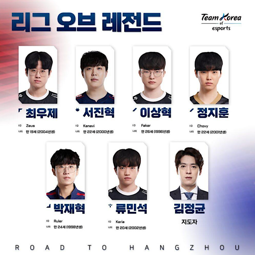 항저우 아시안게임 이상혁 with 롤 lol 리그오브레전드 선수단 명단