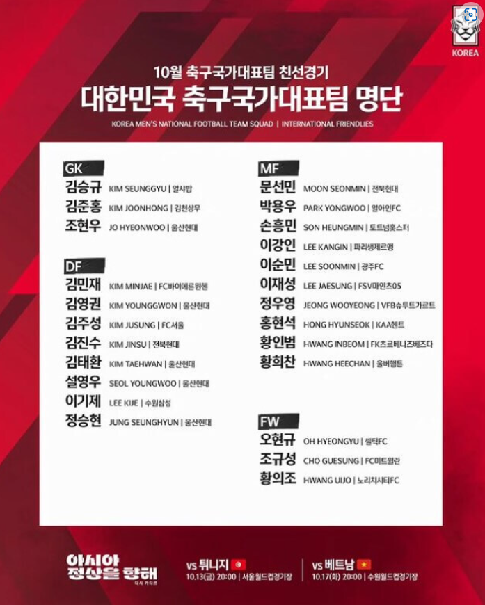 아시안게임에서 금메달을 획득한 이강인도 명단에 올랐으며 손흥민, 황희찬 등 해외파가 다수 포진돼 있다. 이번 2023 항저우아시안게임에서 맹활약을 한 정우영도 포함됐다.