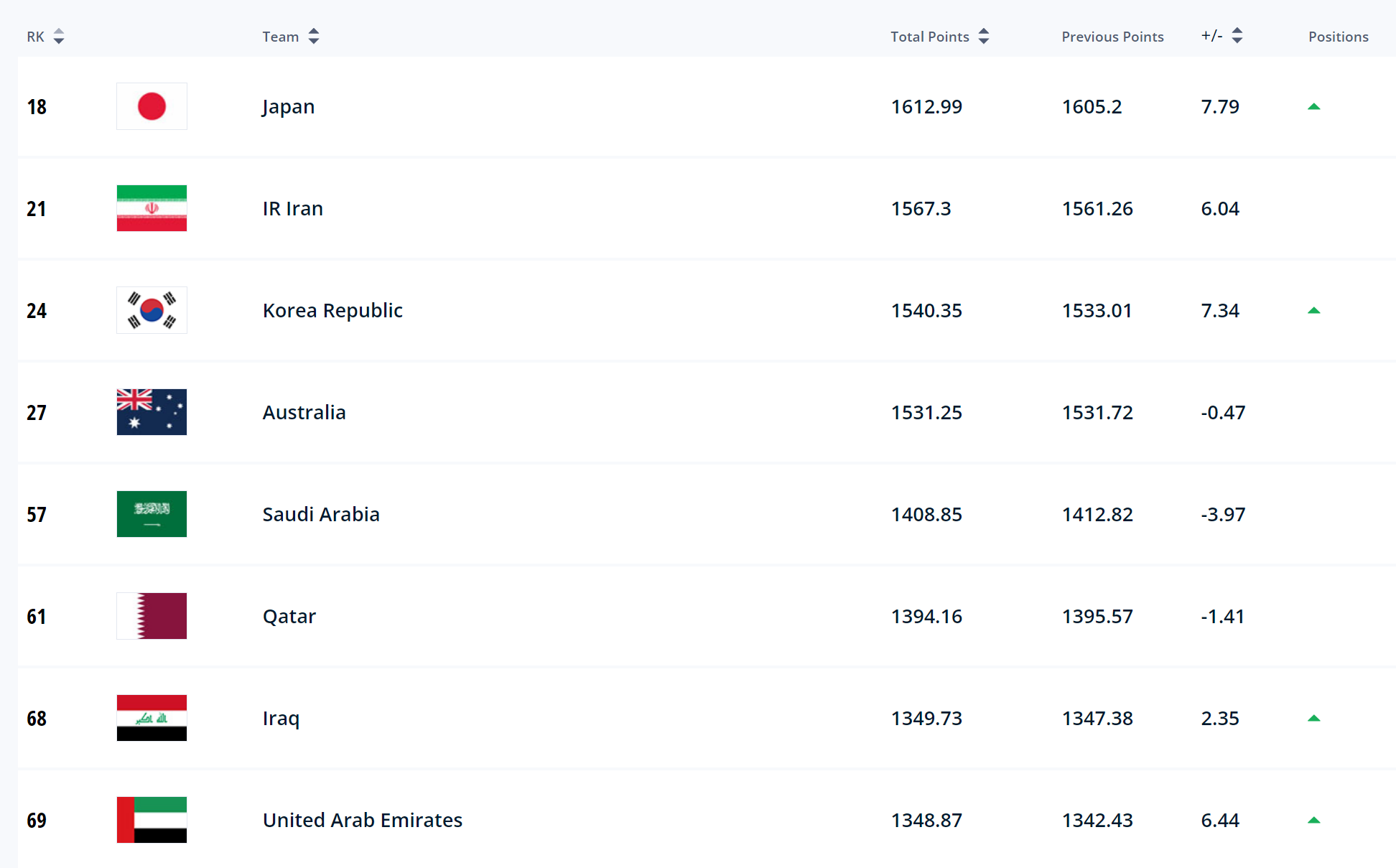 10월 A매치에서 캐나다와 튀니지를 연파한 일본이다. 2위는 이란으로 21위를 기록했다. 이란 다음 한국이 24위로 3위다.