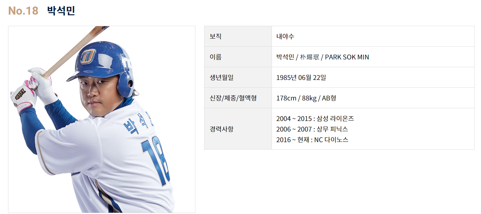 박석민은 2004년 삼성라이온즈에 1차 지명으로 입단했다. 중간에 군 복무를 ㅈ마친 뒤 2008년부터 쭉 삼성의 주전 내야수로 활동했다. 2016년에는 FA 자유계약선수로는 당시 최고금액인 4년 최대 96억원에 NC와 계약을 하면서 이적한다.
